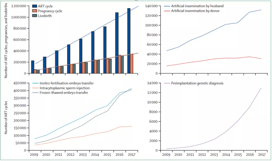 《柳叶刀中国女性生殖、孕产妇、新生儿、儿童和青少年健康特邀重大报告》提到,自中国大陆第一例试管婴儿于1988年诞生以来,三十余年内,中国的辅助生殖技术得到了快速发展,目前总周期数已超过100万周期/年,出生婴儿数逾30万例/年,成功率已基本接近欧美发达国家水平。
