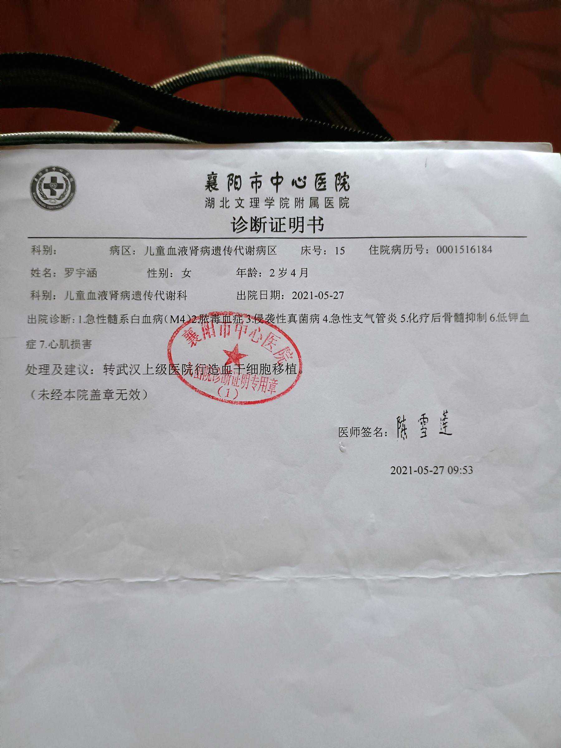 就这样,孩子在爷爷奶奶和亲戚的帮助下住进了医院,进医院第三天做了骨穿和腰穿,并送去做外检,结果出来后是白血病髓系m4高危。医生说,孩子要做造血干细胞移植才能生存,让我们准备几十万块钱。