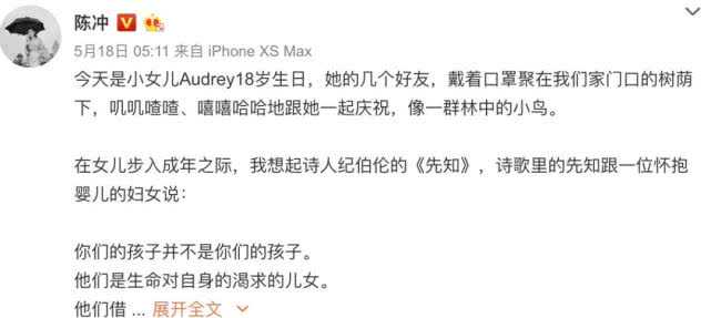 近日,陈冲在社交媒体上发文庆祝小女儿Audrey18岁生日。
