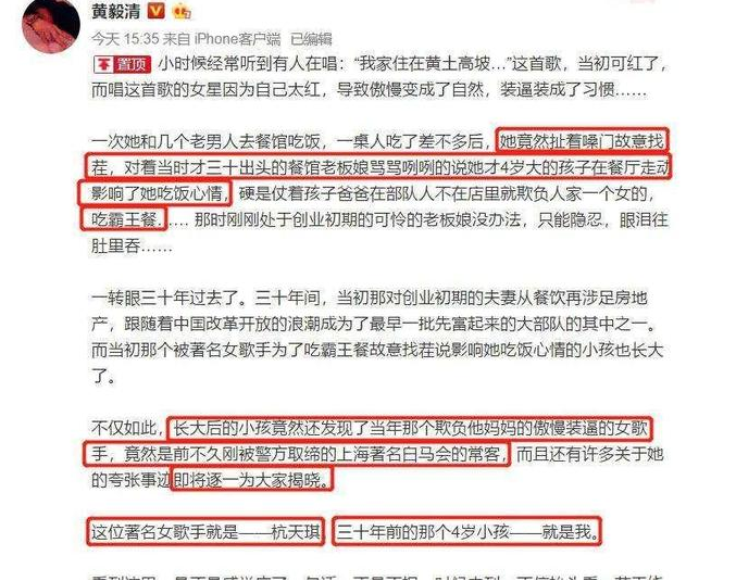 2019年,黄毅清在个人账号上,发布了一篇手撕杭天琪的长文。