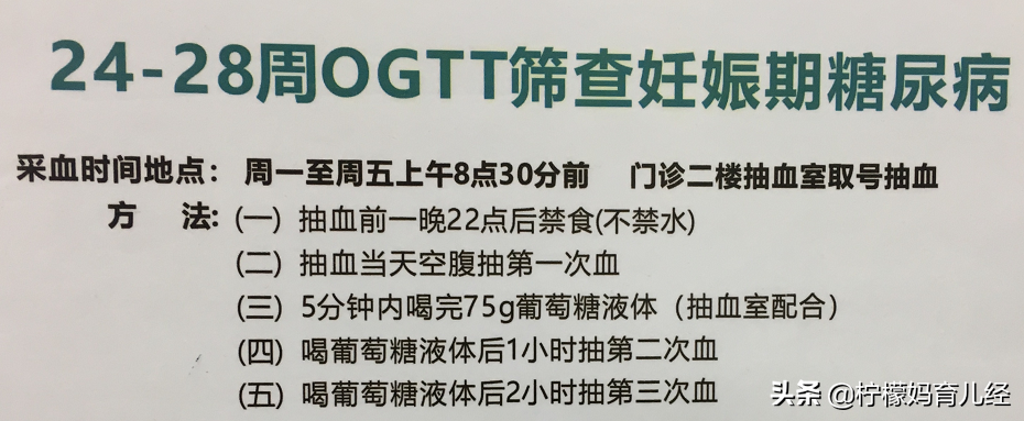 孕24-28周时,孕妈需要到医院做一下OGTT筛查,即糖耐检查,这项产检主要是筛查孕妈是否患有妊娠期糖尿病。