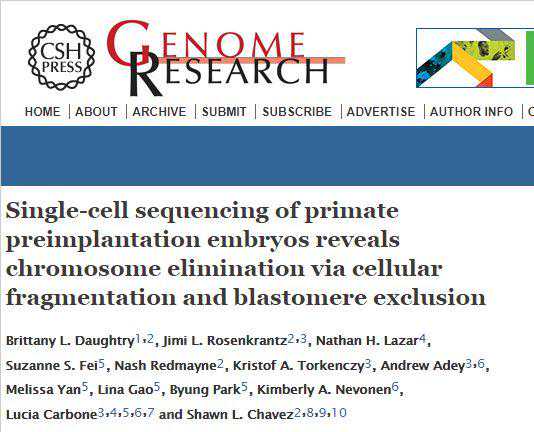研究结果以“Single-cellsequencingofprimatepreimplantationembryosrevealschromosomeeliminationviacellularfragmentationandblastomereexclusion”为题发表在《GenomeResearch》杂志上。