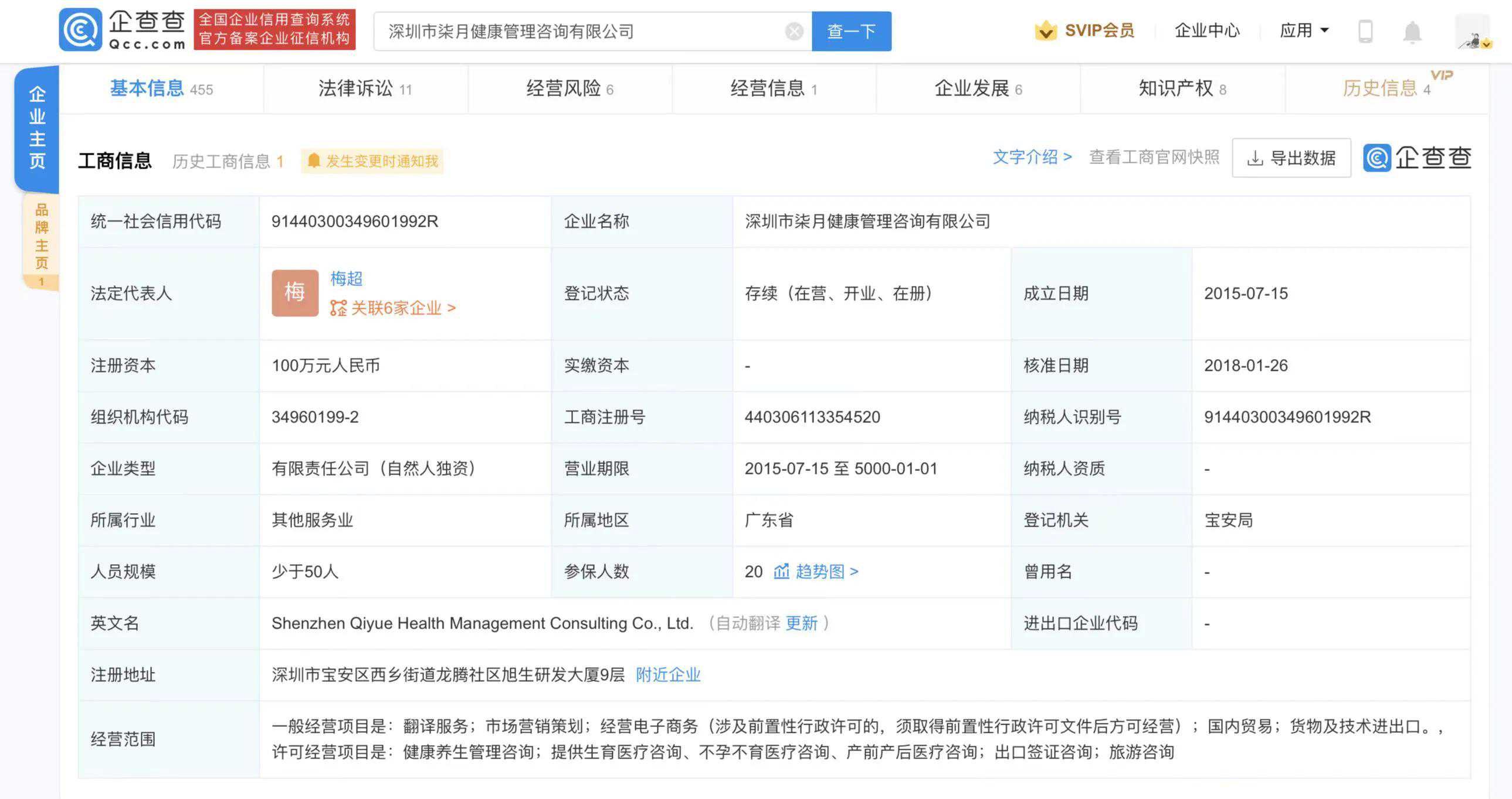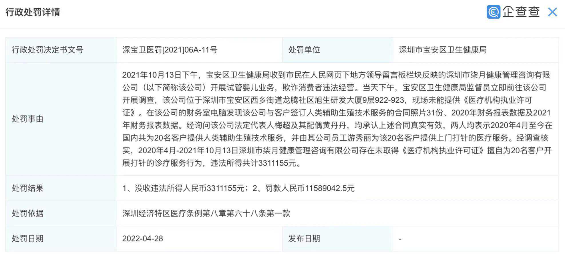 经调查核实,2020年4月-2021年10月13日期间,该公司存在未取得《医疗机构执业许可证》擅自为20名客户开展打针的诊疗服务行为,违法所得共计约331万元。最终深圳市宝安区卫生健康局对该公司处以没收违法所得人民币约331万元并罚款人民币约1158.9万元的决定。企查查显示,该公司成立于2015年,法定代表人为梅超,注册资本100万元人民币,经营范围为翻译服务;市场营销策划;健康养生管理咨询;提供生育医疗咨询、不孕不育医疗咨询、产前产后医疗咨询等。