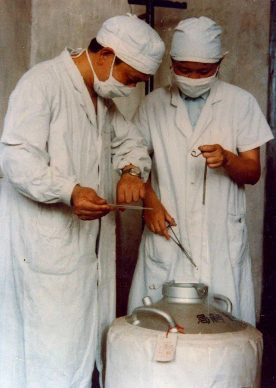 ▷1981年卢光琇(右)指导助手进行精子解冻