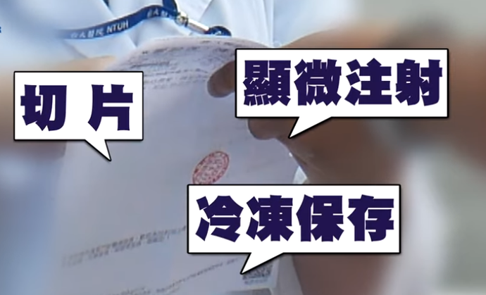 这名医生的白袍上写有明显的“妇产”二字,而从他们手上所拿资料来看,上面还写着“冷冻保存、切片、显微注射”等字眼,这些词和做试管婴儿的流程有所相似。