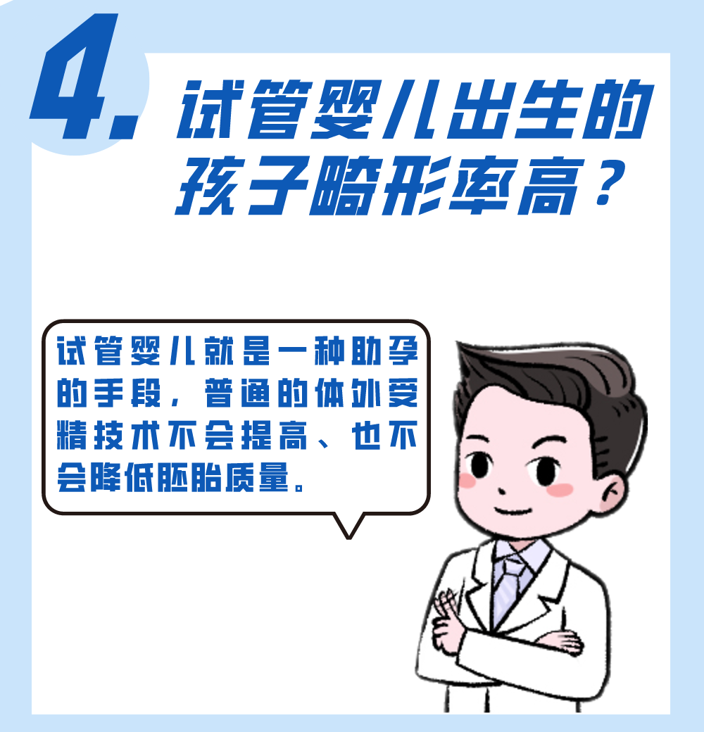 大数据显示试管婴儿技术出生的胎儿总体而言与正常人群发生先天异常的比例相似。有些特殊先天异常的疾病发生率的确高于正常人群,但更多的原因应归于遗传背景,比如严重少弱畸精子症,而非源于试管婴儿技术本身。